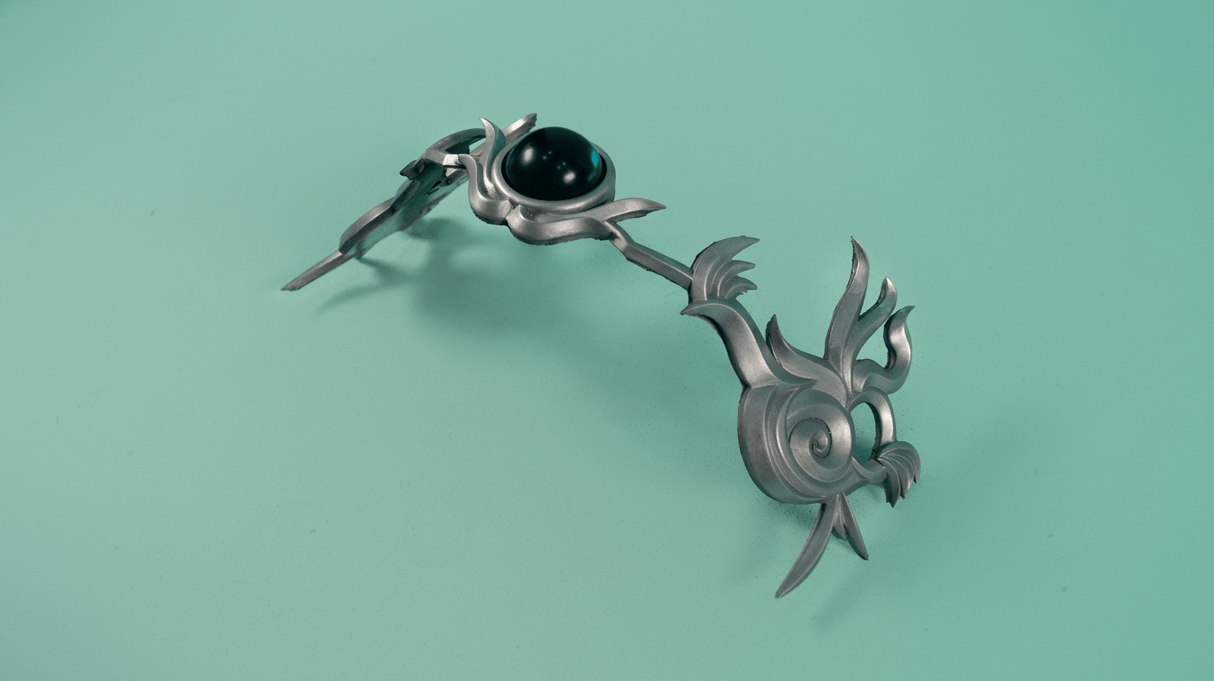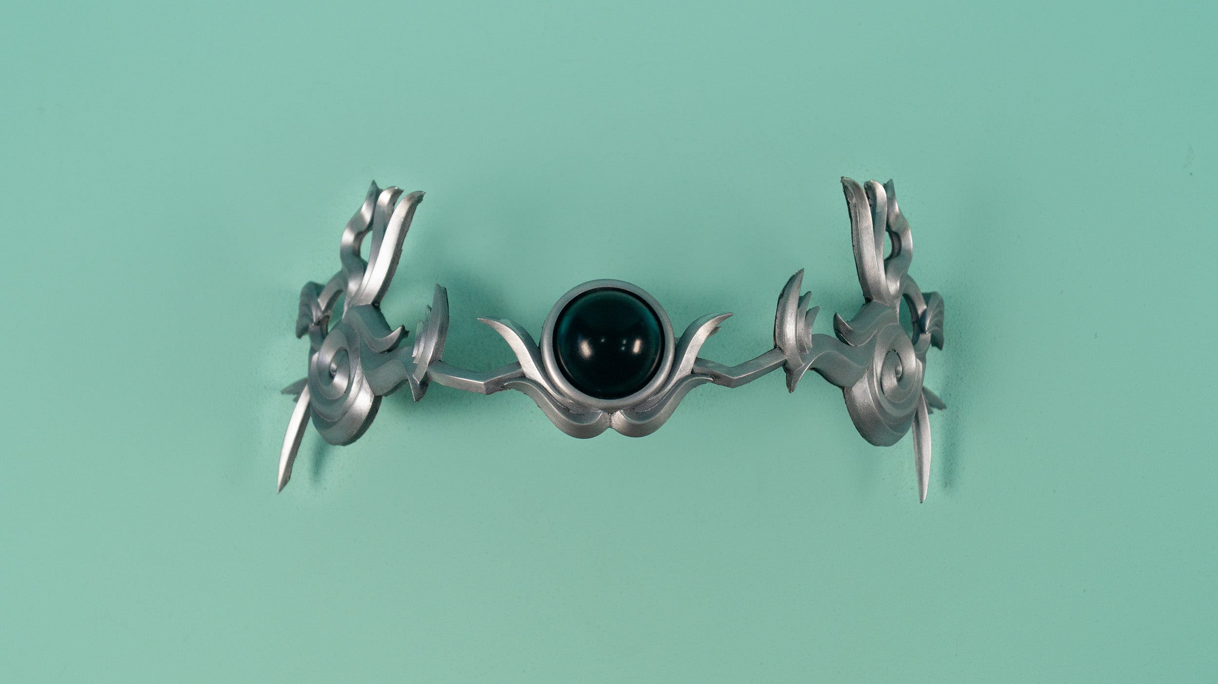 A cold-cast crown for Princess Garnet from Final Fantasy IX. The crown is cast in a flexible resin, with a green resin gem in the center.