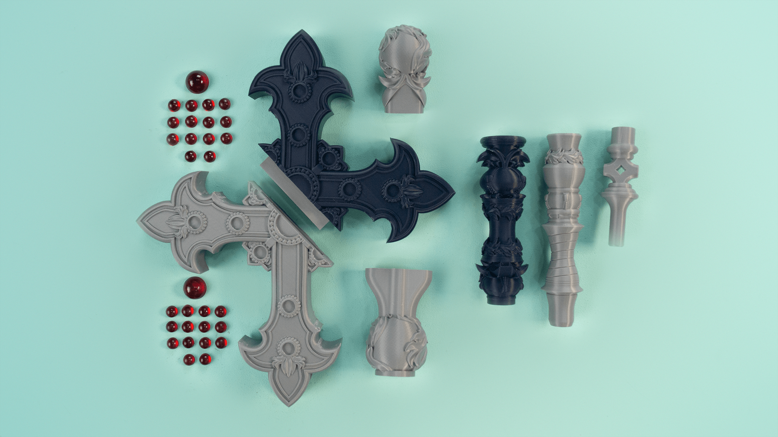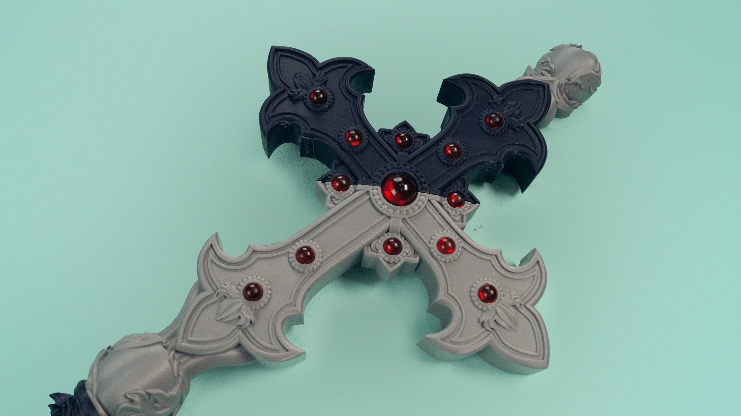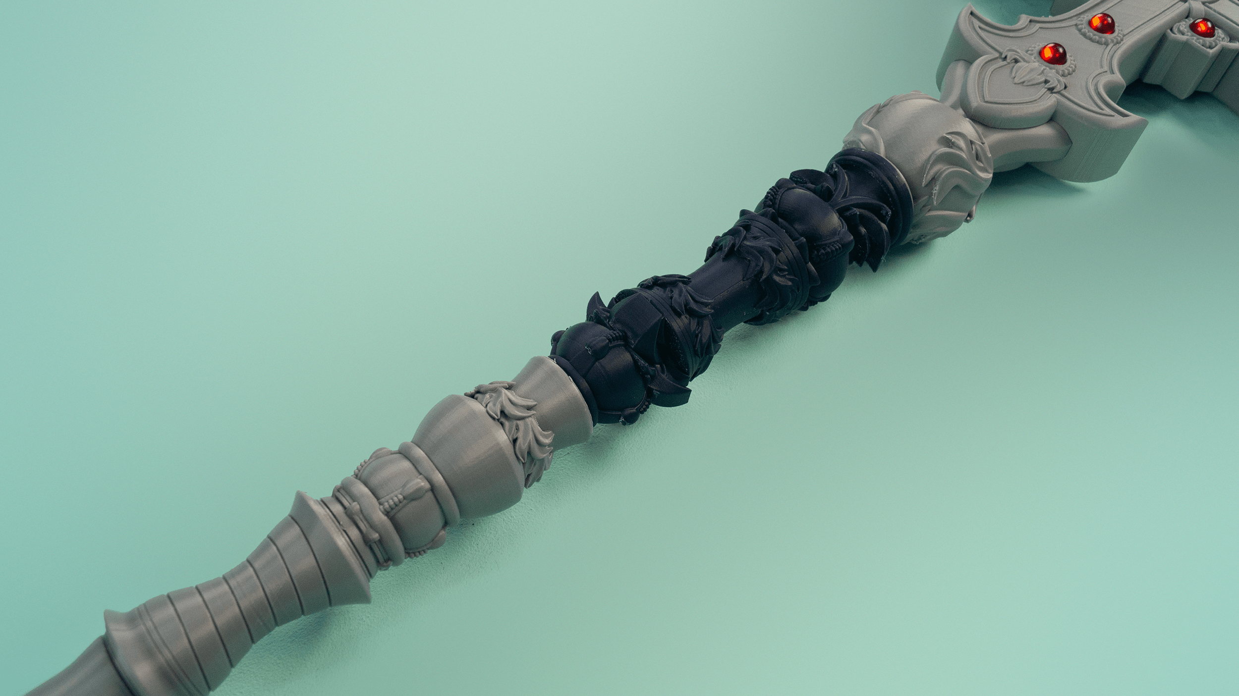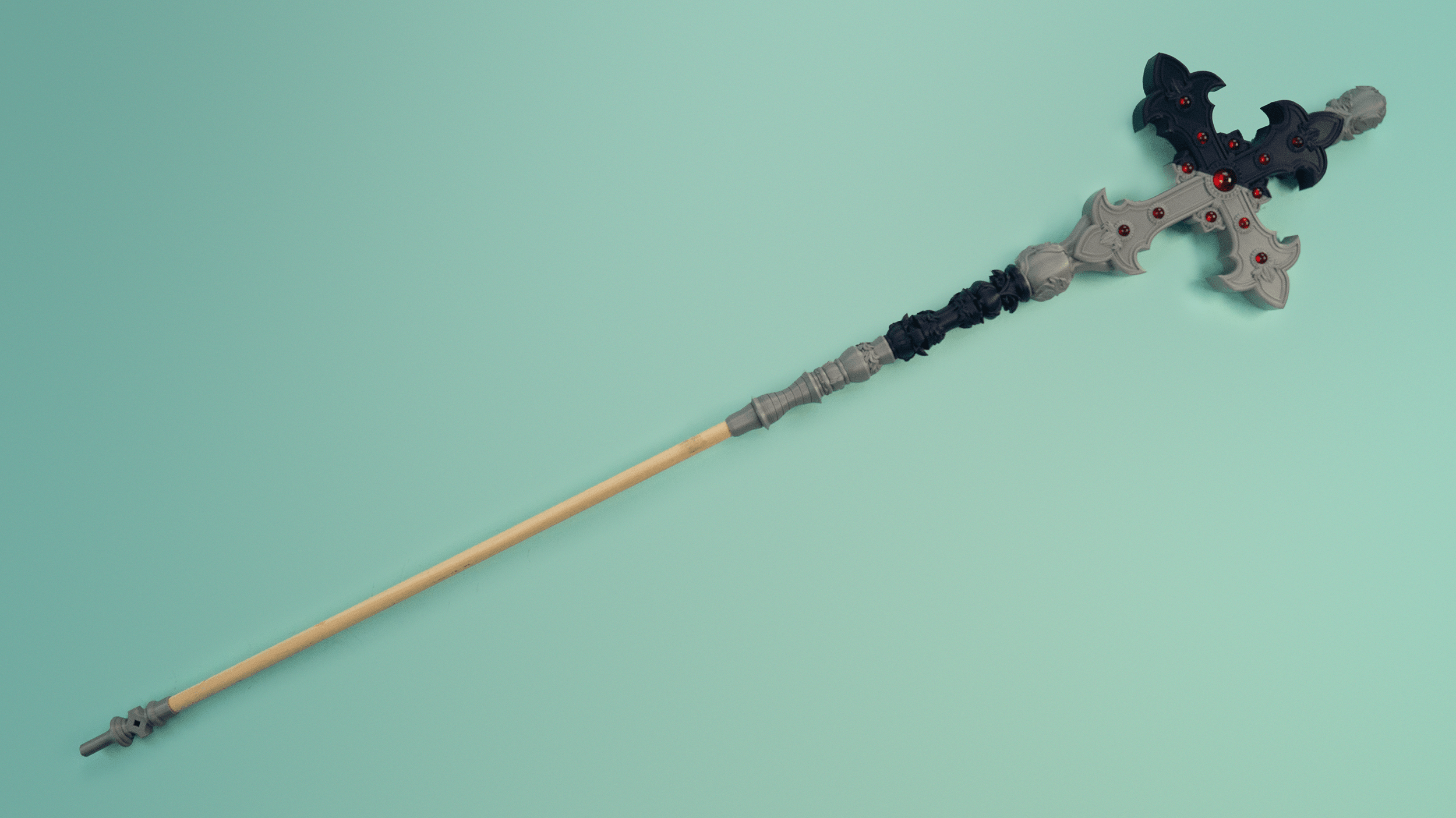 A 3D printed cosplay kit for Caterina Sforza's Staff from Trinity Blood. Finishes at 67" from end to end.