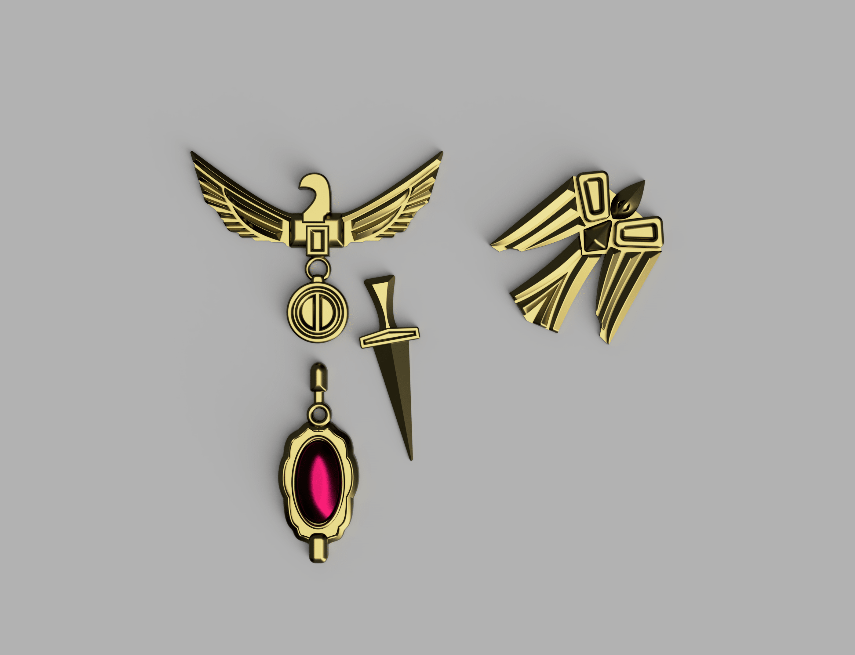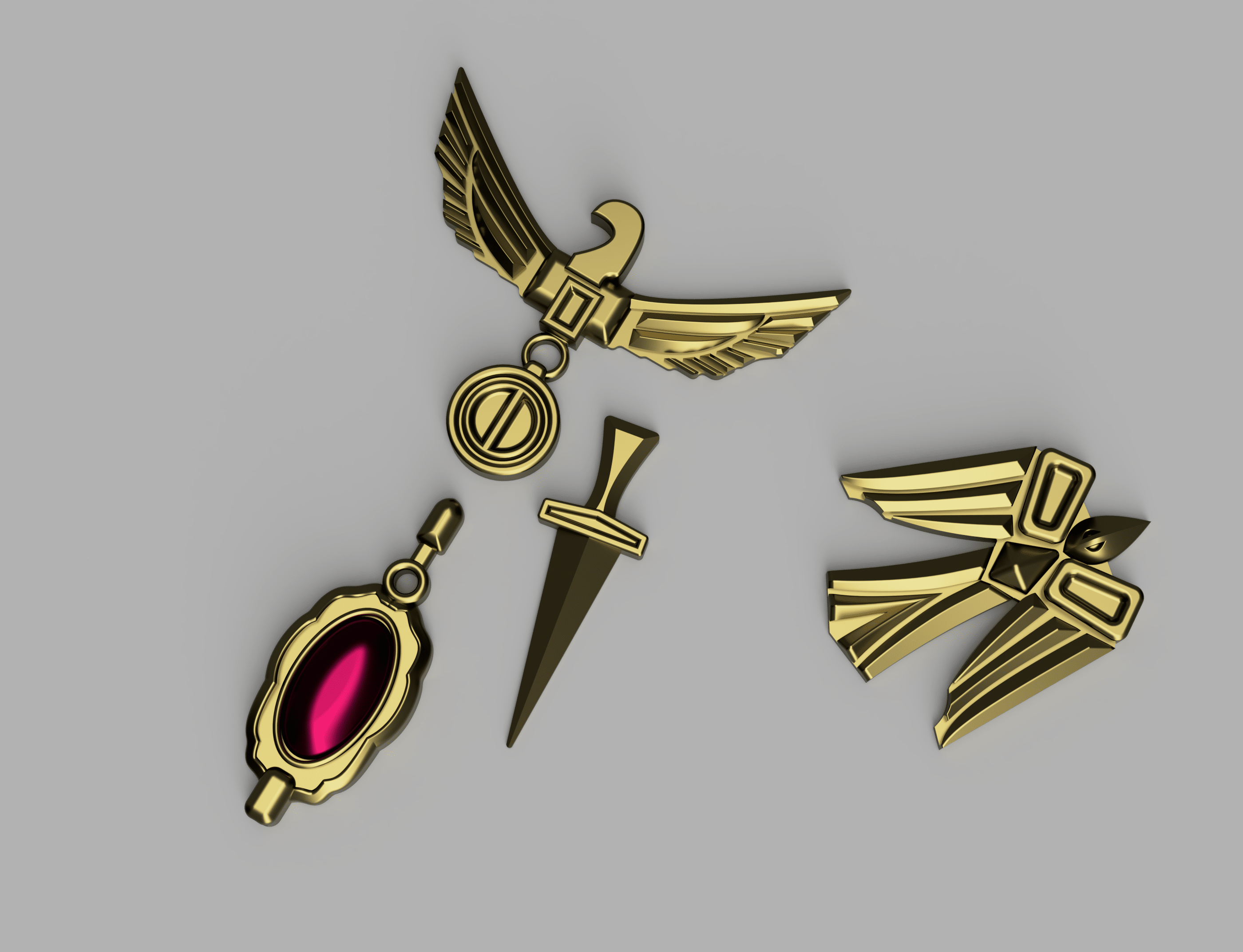 .stl format. Little bits, all flat backed. Easy to print, easy to finish! I suggest using spade bails and jewelry hardware to attach any necessary small rings to link pieces together.