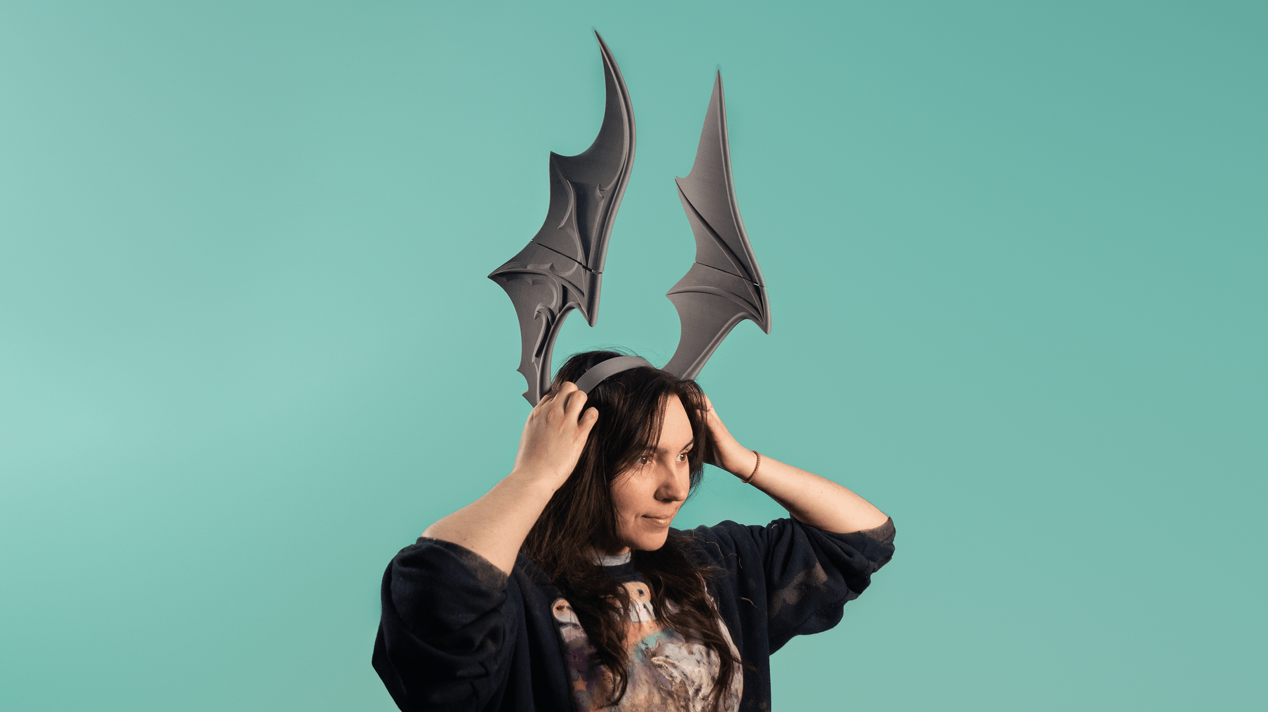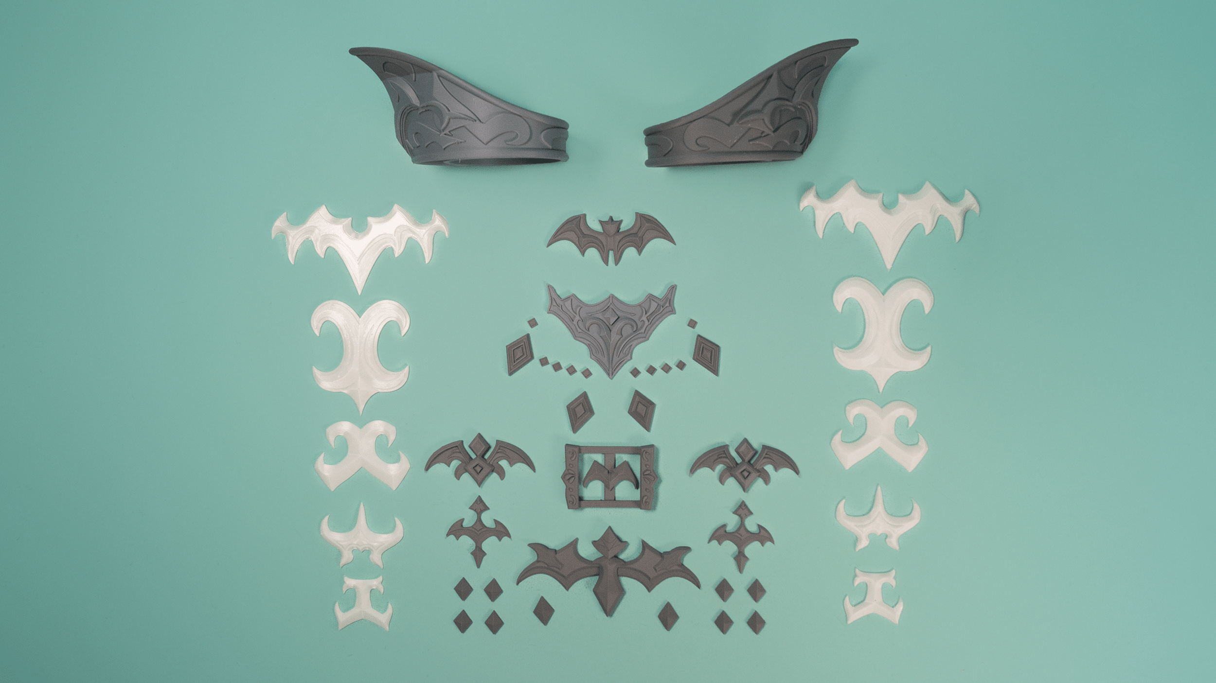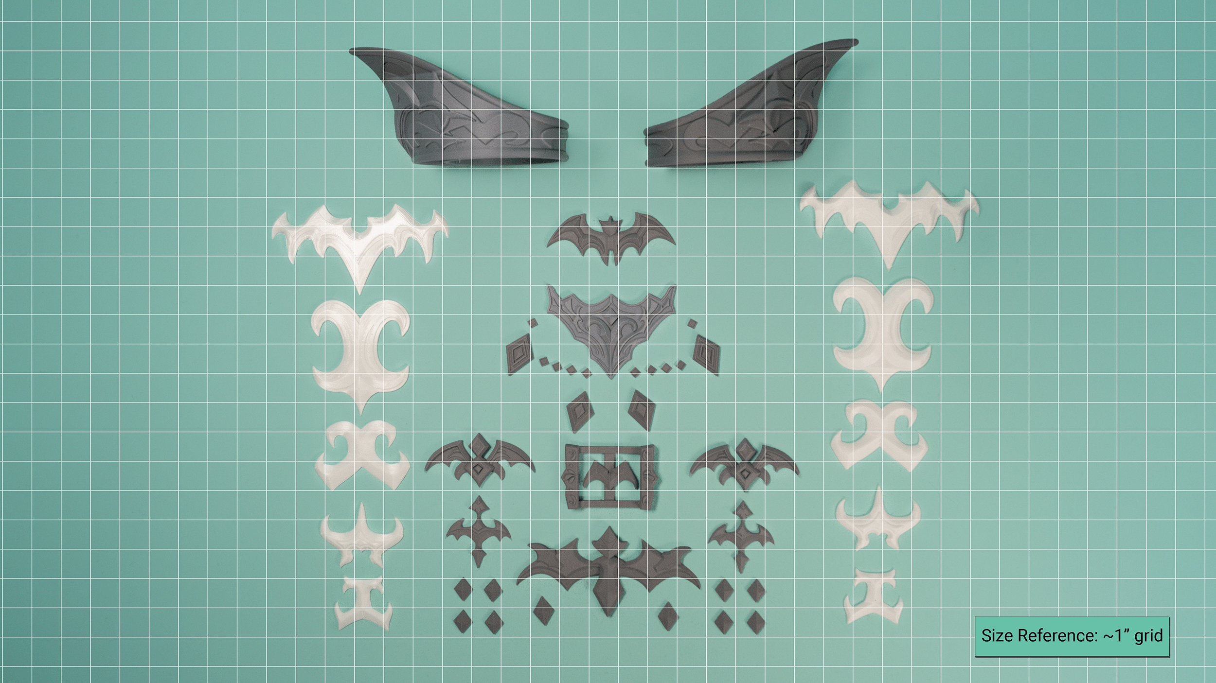 A 3D printed cosplay kit for the Vamp Fatale accessories from FFXIV. Little bits, mostly flat backed, arms and headwings!