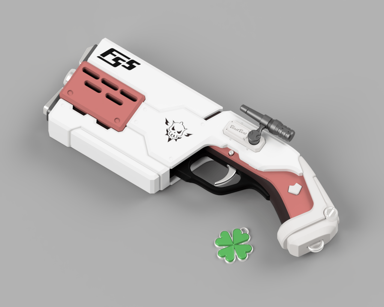 STL format. Handgun is split for 200x200x200mm printers. Assembles at 10" long. No external hardware needed apart from 1-2mm string for the Clover Charms.