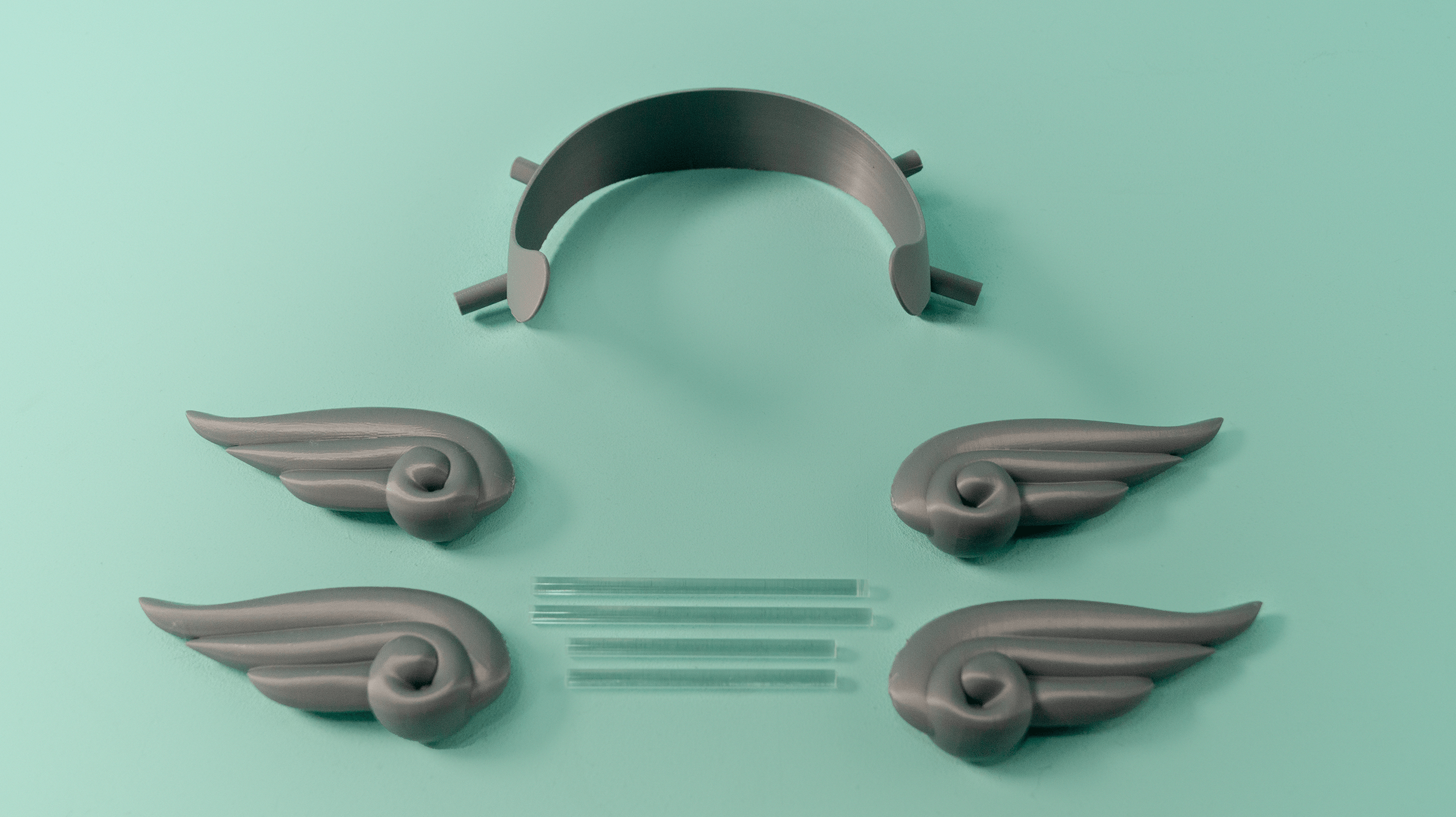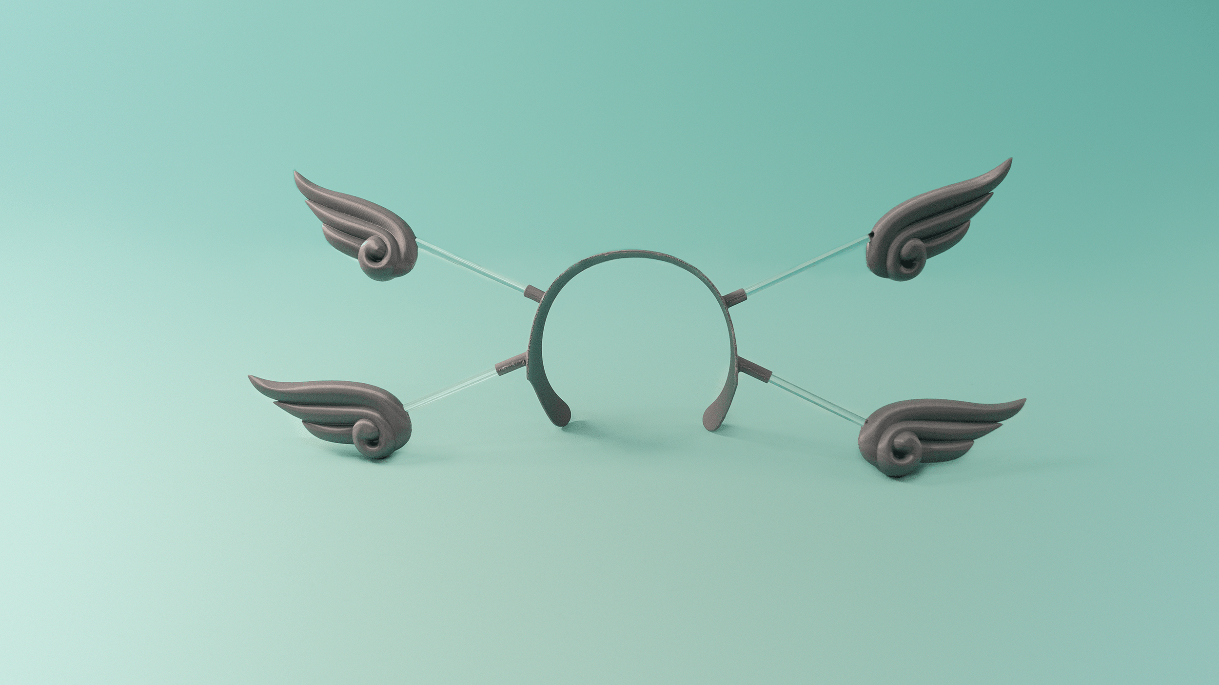 A kit for Hypnos' mini wings from Hades 2. Made to look like they're floating around your head with a headband and clear rods to hide under your wig. Assembles on 1/4" clear acrylic dowels.