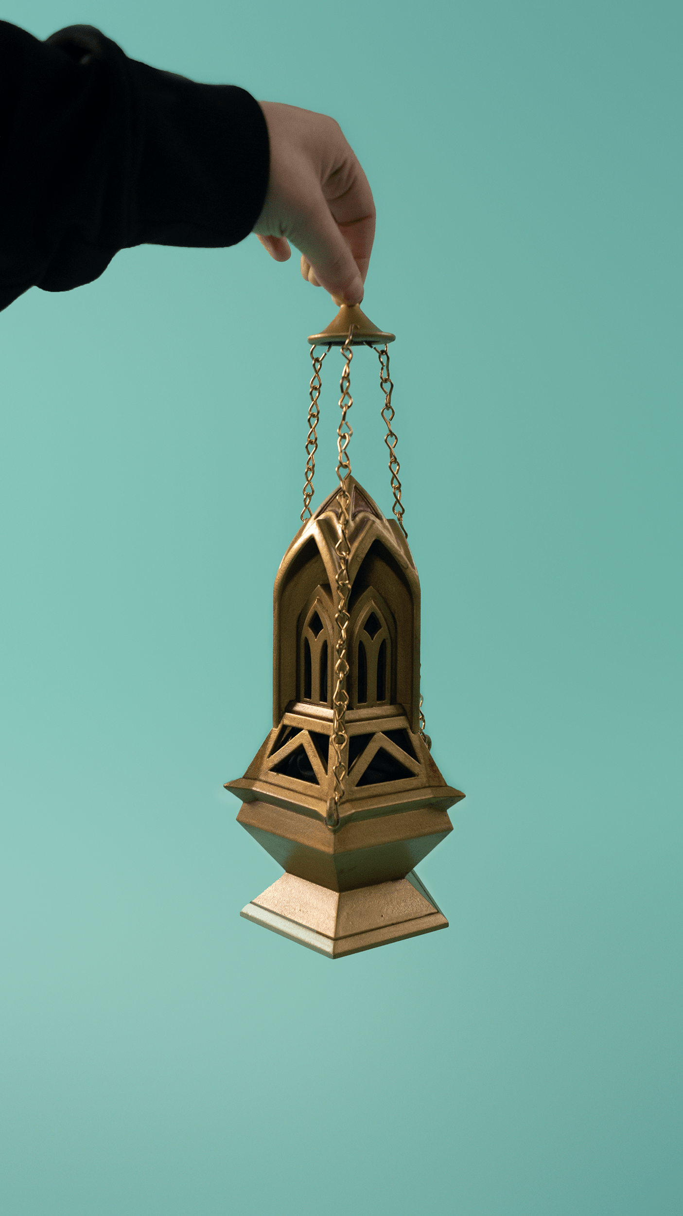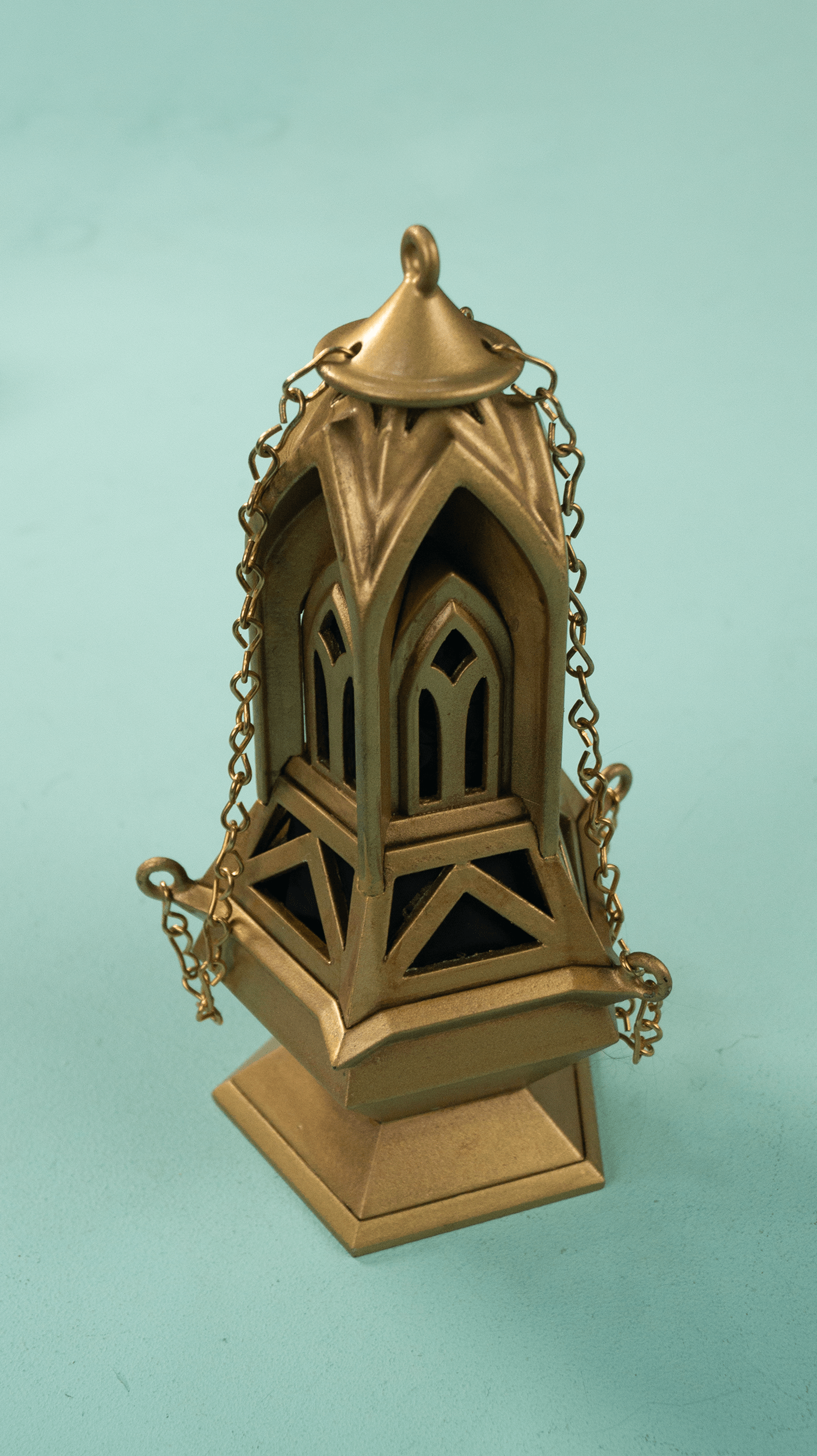 Available as a printed kit, or a fully finished prop painted in hammered metal. The finished prop includes blackout mesh screening and access to put whatever you want inside the censer. Full chain is not included.