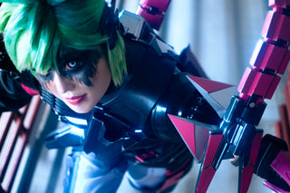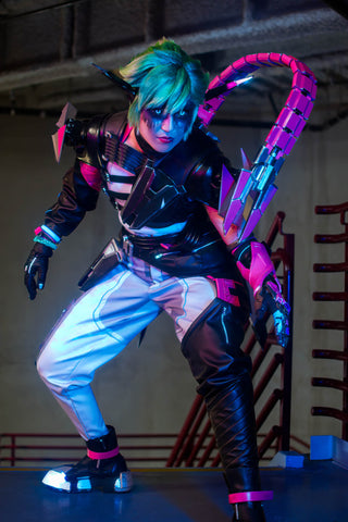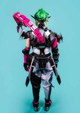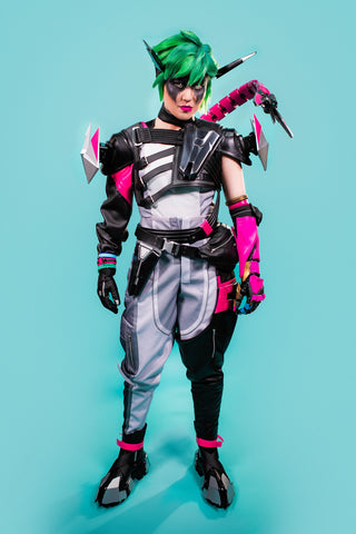 Project Overview: In preparation for the launch of a new character, Respawn Entertainment tasked us with creating her full costume for performance at their e-sports event, ALGS 2024. The character, Alter, is a high-tech hacker and dimension-hopper, and called for specialty armour built for movement. We crafted rubber armour, a latex and urethane robot hand, a puppet tail with moving blades, tech wear with custom printed fabrics.