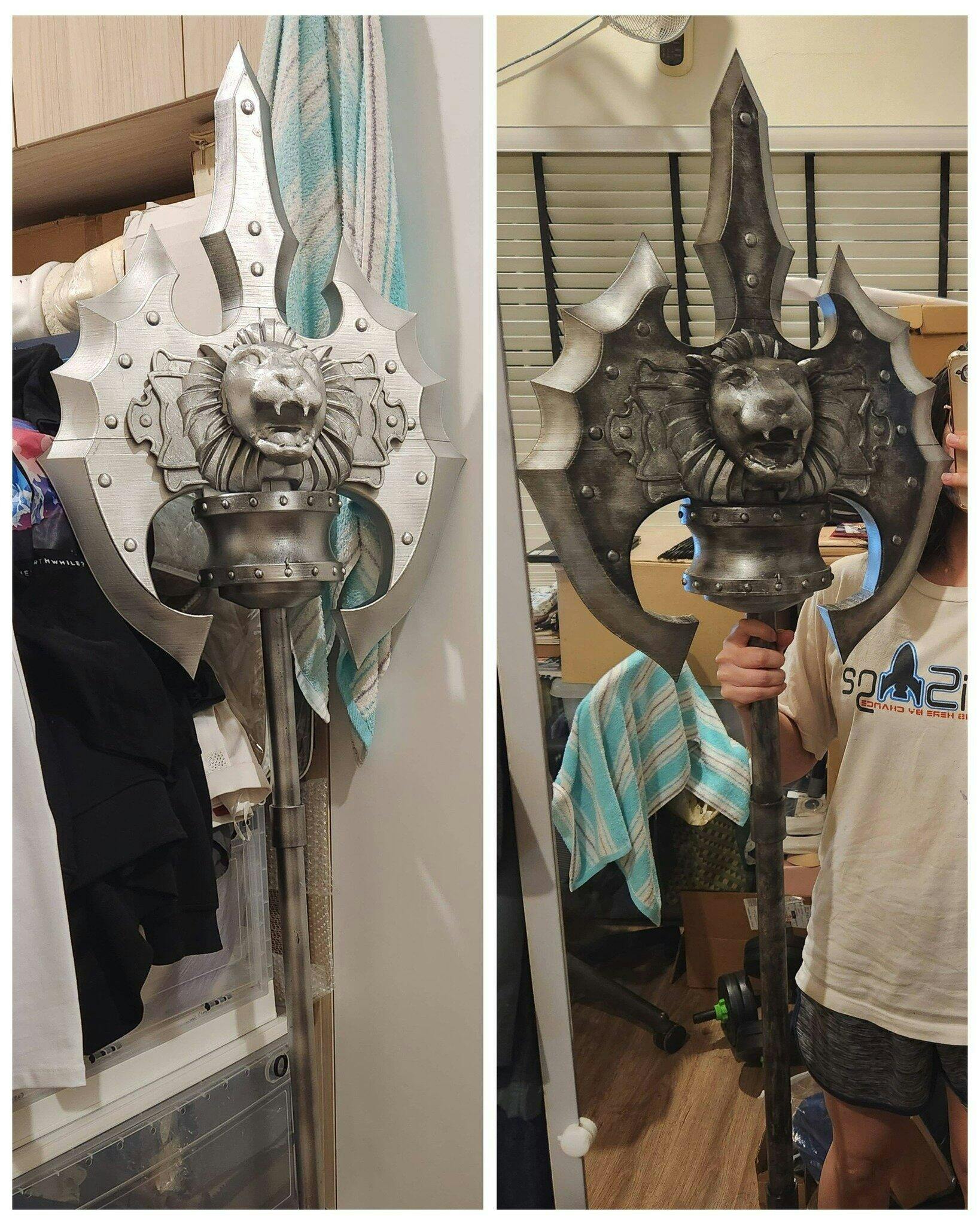 Assembles on a 51" long 1" PVC pipe (schedule 40 or 80), but you can swap it out for a 1.25" wooden dowel with a bit of spare room. (Or print at 94% scale for a tighter fit.) You will also need some chain to wrap around the axehead base.